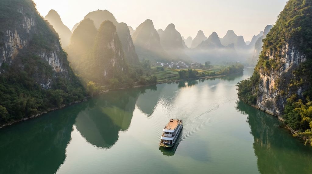 Een tocht over de Li-rivier tussen Guilin en Yangshuo is dé manier om het karstlandschap in volle glorie te ervaren. Grote cruiseschepen varen meestal in 4–5 uur stroomafwaarts, met een panoramadek en vaste vertrektijden in de ochtend. Wie flexibeler wil zijn, kiest voor kleinere boten op trajecten rond Xingping; die bieden dichter contact met het water en meer ruimte voor spontane fotostops. Mis vooral het uitzicht bij de beroemde 20‑yuan‑berg niet, waar de meanderende rivier en de pieken het bankbiljet tot leven wekken. Vroeg vertrekken levert vaak rustiger water en zachter licht op.