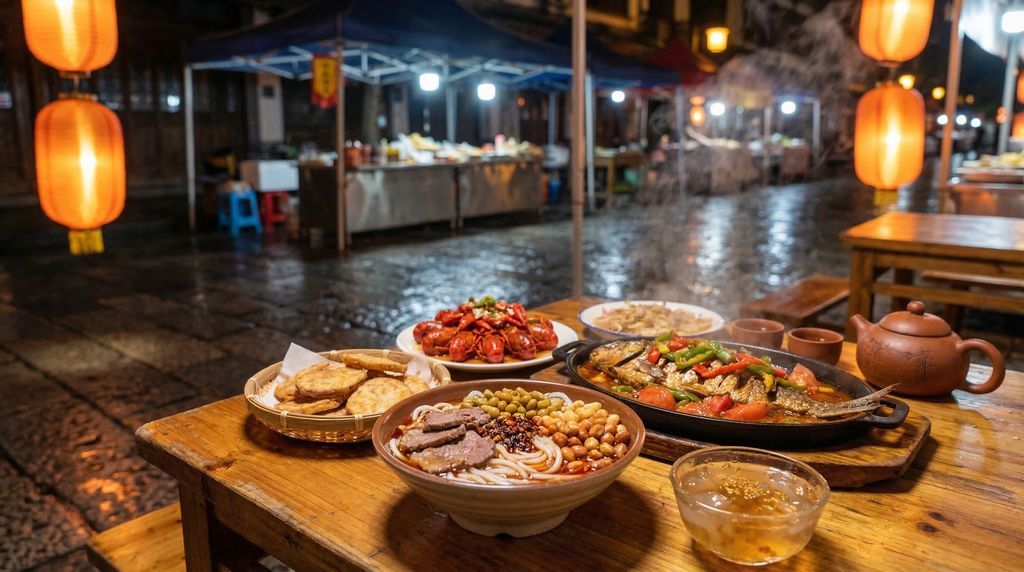 Voor streetfood en avondsfeer is de Zhengyang voetgangersstraat een goede start. Hier vind je spiesjes van gegrilde inktvis, rijstcakejes, vers gebakken noedelgerechten en suikersnoep met fruit. Dichtbij zitten eenvoudige eetzaakjes waar mifen, dumplings en groentegerechten tot laat worden geserveerd. In Yangshuo concentreert het aanbod zich rond West Street, maar de beste vondsten liggen vaak in de zijstraten: kleine familiekeukens die bier‑vis per gewicht bereiden, dampende kleipotgerechten en seizoensgroenten uit nabije akkers. Let op menukaarten per kilo bij visrestaurants; vraag naar de geschatte totaalprijs om verrassingen te voorkomen.