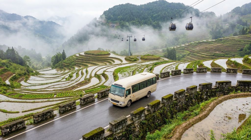 Voor de Longji‑rijstterrassen (Longsheng) zijn er gedeelde busjes en privétransfers vanuit Guilin en Yangshuo. De rit duurt vanaf Guilin circa 2–3 uur, vanaf Yangshuo 3–3,5 uur, afhankelijk van verkeer en dorp (Ping’an of Dazhai/Jinkeng). Bij de toegangspoorten koop je een entreeticket voor het scenic area; binnen het gebied rijden lokale shuttlebussen tussen parkeerplaatsen en dorpsingangen. In Dazhai/Jinkeng is een kabelbaan die snel hoogtewinst geeft en je dicht bij hoge uitzichtpunten brengt. In de Ping’an‑zone zijn er geen kabelbanen; je bereikt de viewpoints via goed aangelegde trappen en paden. Reis licht: de dorpspaden zijn smal en vaak trapachtig. Bij sommige parkeerplaatsen en dorpstoegangen zijn bagagebewaaropties en dragers beschikbaar. Reserveer vervoer in het hoogseizoen vooraf, en haal treinkaartjes bij voorkeur de avond ervoor op om wachttijden in de ochtendspits te vermijden.