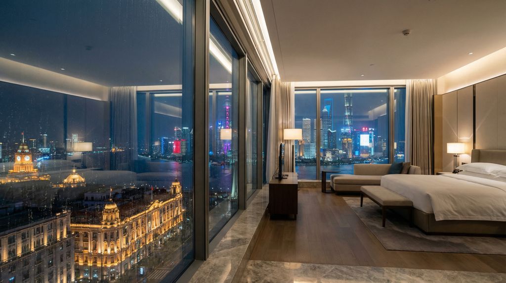 Aan The Bund logeer je tussen neoklassieke gevels met frontrow-zicht op de Huangpu en de torens van Lujiazui. Kies kamers met “river view” of “Bund/Pudong skyline view”, bij voorkeur op hoge etages of als hoekkamer voor bredere zichtlijnen; ’s avonds levert dit het meest dramatische stadsbeeld op. In Lujiazui vind je moderne torenhotels met glazen gevels, ruime kamers en vaak uitstekende fitness- en spafaciliteiten. Let op oriëntatie: kamers richting westen kijken op The Bund, richting oosten op de verder uitwaaierende skyline. Vraag bij boeking om dubbel glas of een rustige verdieping als je licht slaapt; de rivierpromenade kan ’s avonds levendig zijn.