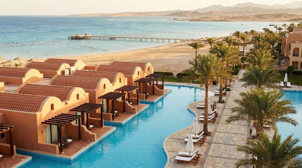 El Gouna staat bekend om rustige luxe, lagunes en twee marinas. Veel hotels liggen aan kalme lagunes met privéstrandjes; kies “Lagoon View” voor directe toegang tot ondiep water of “Sea View” als je de open zee wil zien. De sfeer is verzorgd en relaxed, met boetieks, golf en stijlvolle beachclubs. Een pluspunt is het veelvoorkomende dine-aroundprogramma: bij Halfpension kun je (afhankelijk van hotel en seizoen) dineren in geselecteerde restaurants in de stad, handig voor wie variatie wil. Tuk-tuks en watertaxi’s maken verplaatsen makkelijk; controleer bij boeking of jouw hotel hierop is aangesloten.