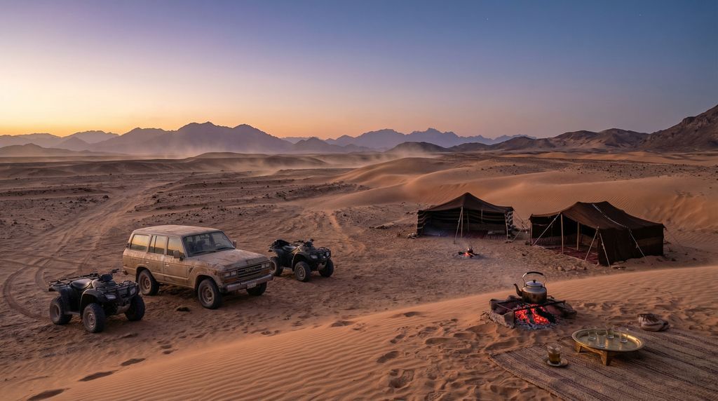 De oostelijke woestijn achter Hurghada ontvouwt zich als een landschap van steenplateaus, wadi’s en zachte zandduinen waar het licht voortdurend verandert. Vanuit de stad rijd je in 20–40 minuten naar een desert station, het startpunt voor tochten die variëren van een snelle quadsessie tot een halve of hele dag met meerdere activiteiten. Ochtenden bieden koelere lucht en scherpe contouren; later op de dag kleurt de zon de heuvels goud en is de temperatuur hoger, met vaak een bries die stof zwiert.