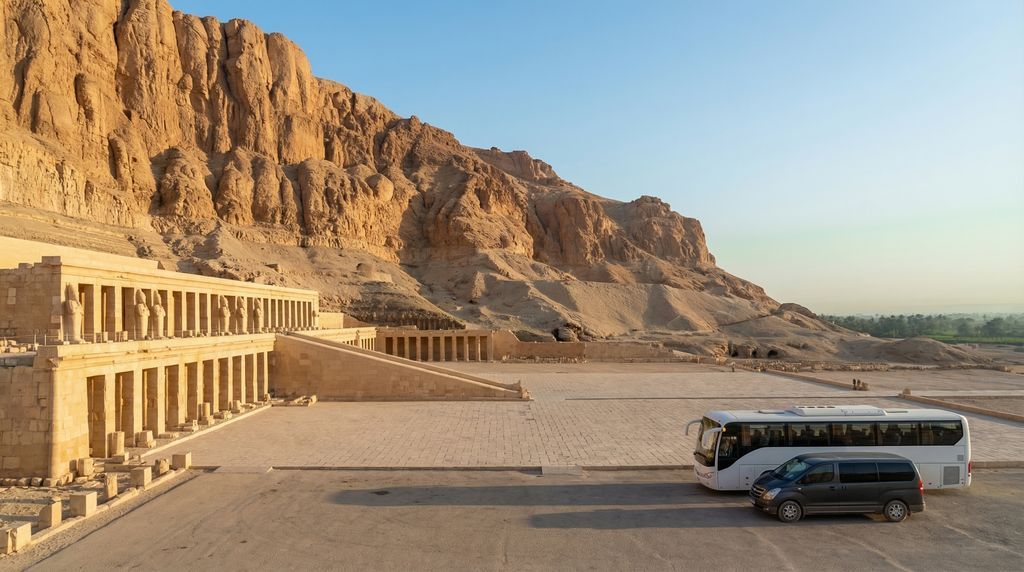Vanuit Hurghada liggen twee van Egypte’s cultuurzwaartepunten binnen bereik. Luxor ligt landinwaarts aan de Nijl; reken per bus op circa 4–5 uur rijden, met een privétransfer vaak 3,5–4,5 uur afhankelijk van stops en verkeer. Caïro ligt noordelijker; per bus duurt dit doorgaans 6–7,5 uur, met een privétransfer 5,5–7 uur. Dagtochten starten meestal vroeg (tussen 04.30 en 06.00 uur) en keren laat terug. Een comfortabele bus of minivan met airco, een nekkussen en snacks maken de lange ritten aanzienlijk aangenamer.