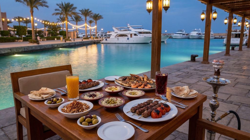 Waar eten? Aan de Marina vind je stijlvolle terrassen met uitzicht op jachten, variërend van moderne Egyptische bistro’s tot mediterrane en Aziatische keukens. De sfeer is ontspannen chic en ideaal voor een avondwandeling van bar naar restaurant. Langs Sheraton Road bruist het van betaalbare eethuisjes, bakkerijen en straatkraampjes met shoarma, ta’ameya (Egyptische falafel) en verse sapbars; perfect voor een informele proeverijroute. In hotels kun je terecht voor uitgebreide buffetten en à-la-carterestaurants; bij all-inclusive formules is vaak reserveren nodig voor de specialiteitenzaken. Een leuke tip voor seafood-liefhebbers: kies aan de vismarkt of in visrestaurants je “catch of the day” aan de toonbank en laat die tegen kiloprijs grillen; vraag om gemengde mezze, brood en een frisse saladeschotel erbij.