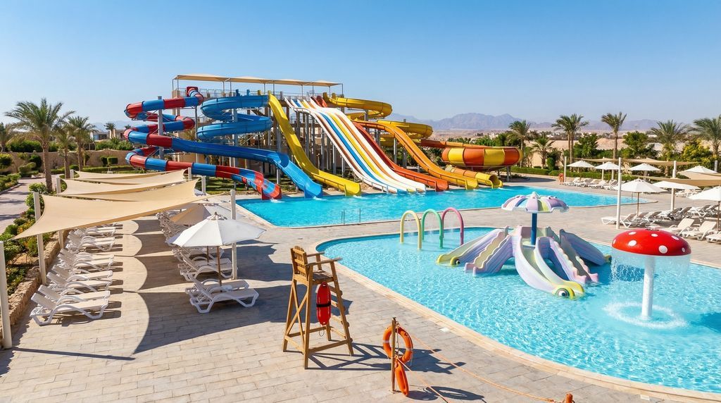 Makadi Water World, ten zuiden van de stad, is een favoriet voor gezinnen met tieners dankzij multi-lane racers, trechters en raftslides waar je in duo- of familiebanden gaat. Rustiger alternatieven zijn de lazy river en golfslagbaden. Dagpassen zijn beschikbaar, inclusief toegang tot faciliteiten; controleer vooraf wat is inbegrepen (handdoek, lunch, drankjes) en of transfer geregeld kan worden. De rit vanuit centrale Hurghada duurt doorgaans 25–45 minuten, afhankelijk van verkeer. Voor kleine kinderen zijn er ondiepe splashgebieden met miniglijbanen; een opblaasbare zwemring of drijfvest geeft extra zekerheid.