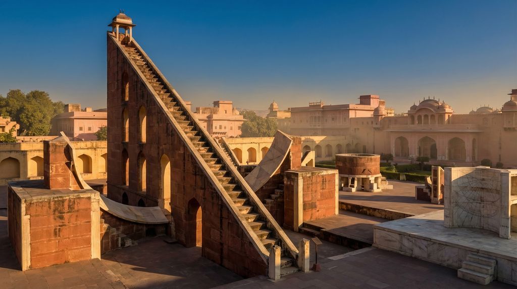 Architectuur en wetenschap ontmoeten elkaar in het Jantar Mantar van Jaipur (UNESCO), een openluchtobservatorium met monumentale meetinstrumenten in steen en marmer. De Samrat Yantra (zonnemeter), Jai Prakash en Rama Yantras dienden om tijd, schaduwen, declinatie en hemelcoördinaten met verbluffende precisie te bepalen. Even visionair is de ommuurde stad van Jaipur (UNESCO): opgezet volgens een strak stratenraster en principes uit de Vastu Shastra, met royaal bemeten bazaars, ritmische arcades en roze gepleisterde gevels. Stadspoorten als Ajmeri en Sanganeri, koepels en chhatri’s zorgen voor een harmonie tussen handel, ceremonieel en stedelijke esthetiek.