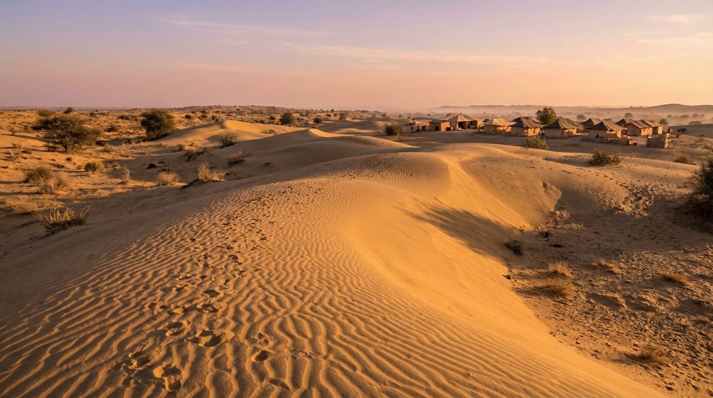 De Tharwoestijn ontvouwt zich als een zee van zand en scrub, waar wind ribbels in de duinen trekt en de horizon trilt in het middaglicht. Rond Jaisalmer liggen Sam en Khuri, klassieke uitvalsbasissen voor kameelsafari’s: langzaam wiegend over de duinen, met pauzes voor chai en de geur van houtvuur. Overnachten in de duinen betekent sterrenkijken bij een inktzwarte hemel en wakker worden met een bleke zonsopkomst die het zand goud kleurt. Er zijn eenvoudige tentenkampen met traditionele maaltijden, maar ook comfortabelere desert camps met privébadkamers. Kies voor een late namiddagrit of vroege ochtendsafari om de hitte te mijden; wie meer vaart wil, kan een 4x4-duinsafari combineren met een korte kameeltocht.