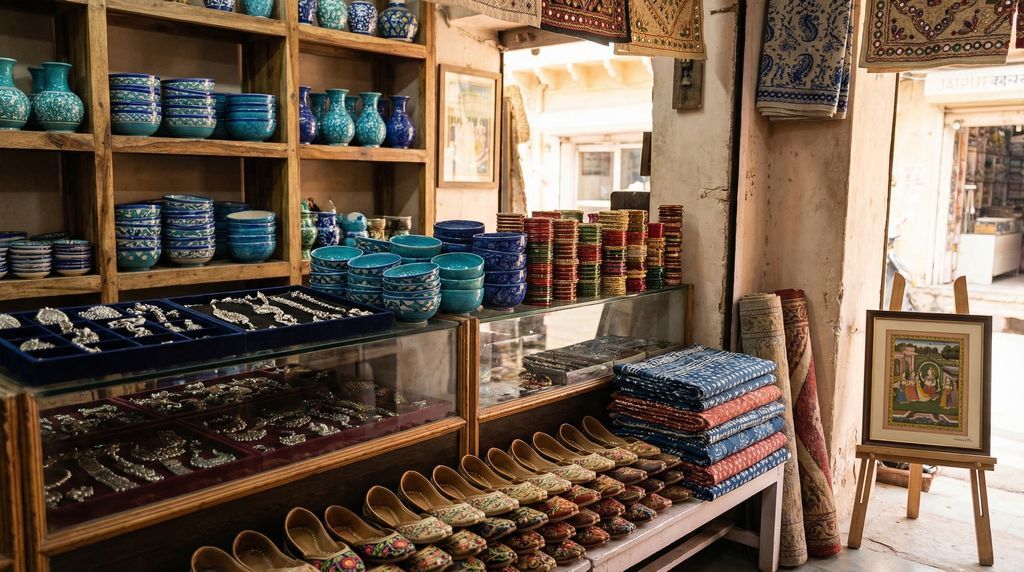 Van stof tot steen: Rajasthan is een schatkamer voor liefhebbers van ambacht. In Sanganer en Bagru, net buiten Jaipur, vind je textiel met hand-blockprints en dabu-resist, in indigo en madderrood gekleurd. Jaipur zelf staat bekend om blue pottery met turkooisblauwe glazuren, en om Johari Bazaar, hét adres voor zilver en sieraden, van kundan tot tribal. In Tripolia glanzen lakarmbanden in regenboogtinten. Leren tassen en riemen, plus handgestikte juttis, duiken op in de bazaars van Jaipur en Jodhpur. Voor vloerkleden en dhurries kun je terecht in ateliers rond Jaipur, Bikaner en Barmer. Miniatuurschilderingen—fijn als een penseelstreek—vind je in Udaipur en Kishangarh, elk met eigen stijlkenmerken. Handgeborduurde stoffen met spiegeltjes en kleurrijk garen zijn geliefd in Jaisalmer en de dorpen van Shekhawati, waar haveli-steden ook kleine ateliers huisvesten.