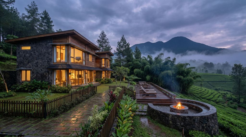 Voor frisse berglucht en vergezichten liggen Puncak en Cisarua voor de hand. De temperatuur zakt ’s avonds merkbaar, mist kruipt tegen de theeheuvels op en veel accommodaties richten zich op gezinnen: berghotels met familiekamers, houten cottages, glamping‑tenten en ruime villa’s met keuken en vuurplaats. De nabijheid van Taman Safari is een pluspunt voor wie met kinderen reist. In het weekend kan het druk zijn en hoor je verkeer over de pas; doordeweeks is het rustiger. Kies waar mogelijk een kamer aan de bergzijde en controleer of er verwarming, extra dekens of een haard aanwezig is. Voor reizigers die foto’s willen maken bij zonsopgang zijn locaties op of nabij een heuvelkam ideaal.