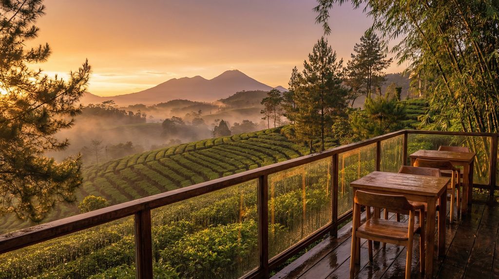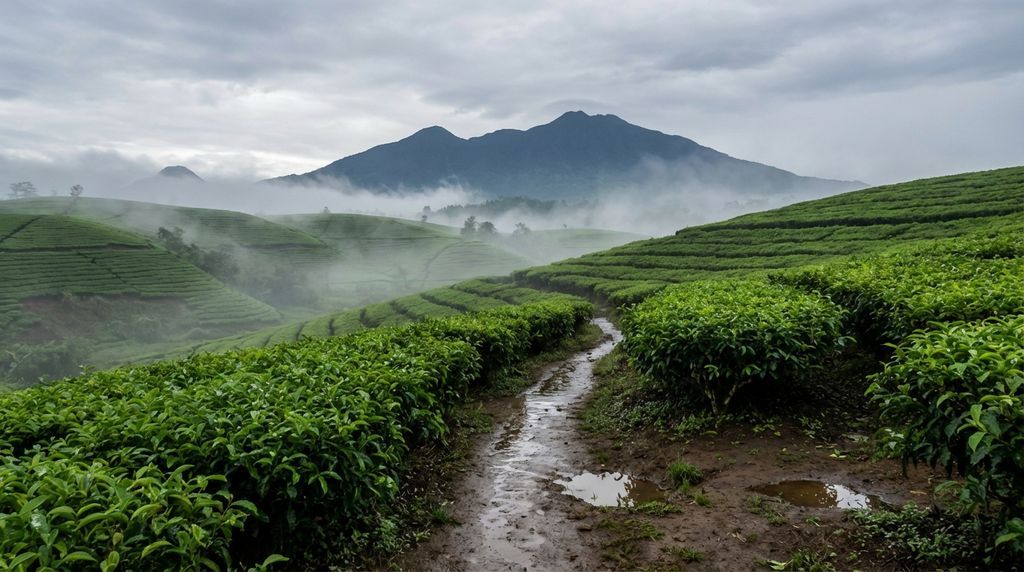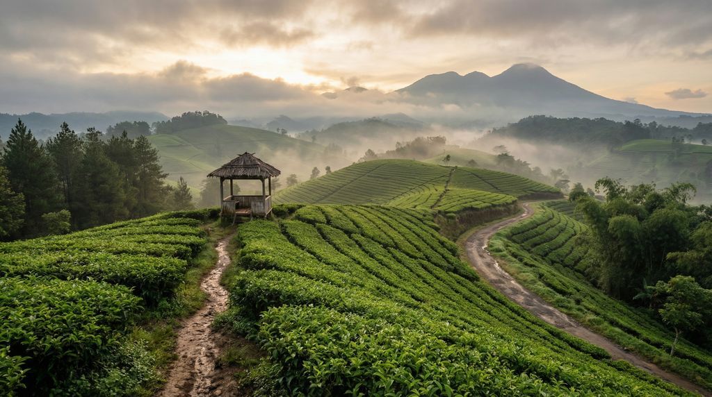 De heuvelrug van Puncak ontvouwt zich in golvende lijnen van felgroene theevelden, afgewisseld met dennen, mistflarden en schilderachtige valleien. De lucht is koeler dan in de laaglanden en draagt de geur van nat blad en vers geplukte scheuten. Slingerende wegen klimmen langs bergflanken en geven telkens nieuwe panorama’s richting de toppen van Gede-Pangrango. In de vroege ochtend, wanneer de zon laag staat en de dauw nog op de bladeren rust, krijg je het helderste zicht op de terrasvormige patronen die de heuvels ritmisch tekenen.