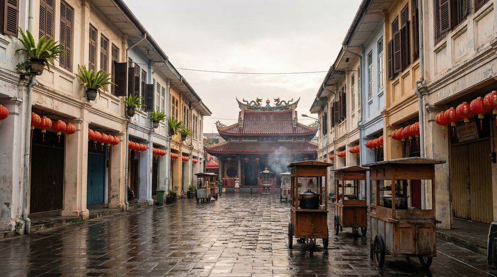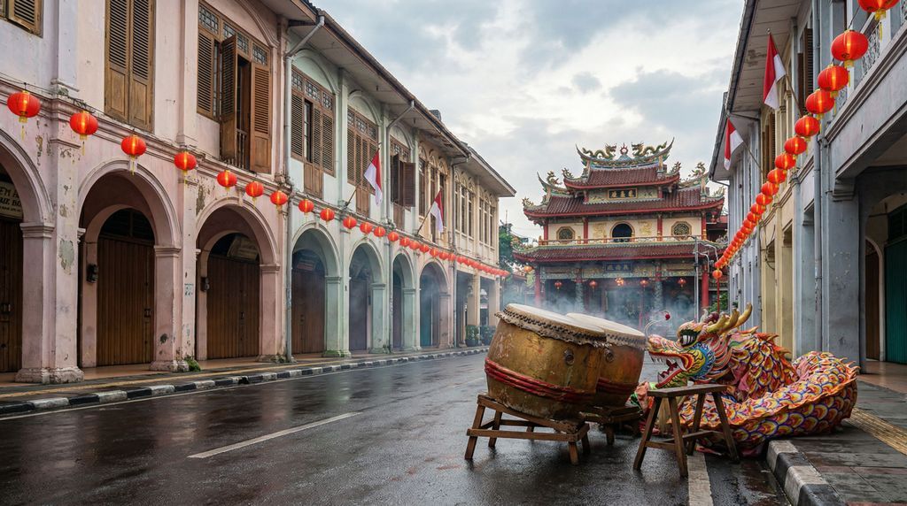 Onder de schaduw van aaneengesloten arcades ontvouwt Jalan Suryakencana zich als een levendige erfgoedstraat vol shophouses met houten luiken, verweerde tegelpatronen en bescheiden balkons. De Chinese‑Indonesische invloeden zijn zichtbaar in roodgelakte deuren, hangende lantaarns en goudkleurige kalligrafie op oude uithangborden. Tussen de gevels ruik je wierook en gebrande kruiden, hoor je het gekletter van pannen en het gezoem van brommers die zich een weg banen langs winkeltjes voor keukengerei, kruidendrogers en traditionele banketbakkers. Het is een plek waar handel, geloof en dagelijks leven naadloos samenkomen.