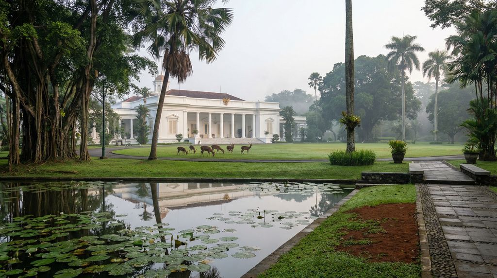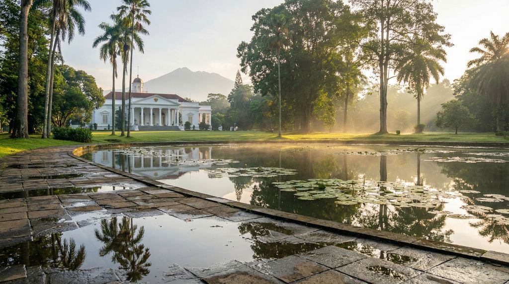 Het presidentieel paleis van Bogor is een fraai staaltje neoklassieke architectuur met witte zuilen en brede veranda’s, ingebed in een golvend parklandschap. Zijn geschiedenis gaat terug tot de 18e eeuw, toen het als Buitenzorg diende voor VOC-functionarissen en later gouverneur-generaals. Na de zware aardbeving van 1834 werd het herbouwd als laag, paviljoenachtig complex dat bestand moest zijn tegen schokken en tropisch klimaat. Sinds de Indonesische onafhankelijkheid maakt het deel uit van de vijf nationale presidentiële paleizen, een plek voor ontvangst van staatshoofden en culturele ceremonies. De ligging aan de rand van Kebun Raya Bogor zorgt voor een harmonieuze overgang tussen formele tuinen, vijvers en monumentale bomen; het lijkt soms alsof het paleis uit de groene massa oprijst.
