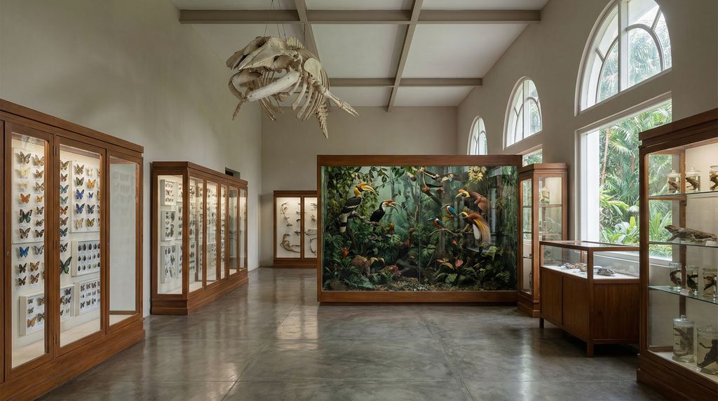De entomologische sectie is een trekker: vitrines met vlinders, kevers en libellen tonen kleurvariaties en zeldzame endemen. In aangrenzende zalen vind je vogels met opvallende baltsveren, reptielen en amfibieën die de vochtige laaglanden bewonen, en een overzicht van vissen en zeeleven met schelpen, koralen en selecties van zeezoogdieren. Didactische panelen leggen verbanden tussen habitat, evolutie en verspreiding, met aandacht voor biogeografische zones zoals Wallacea. Je ziet hoe eilanden isoleren en soorten uniek maken, en waarom Indonesië tot de meest biodiverse landen op aarde behoort.