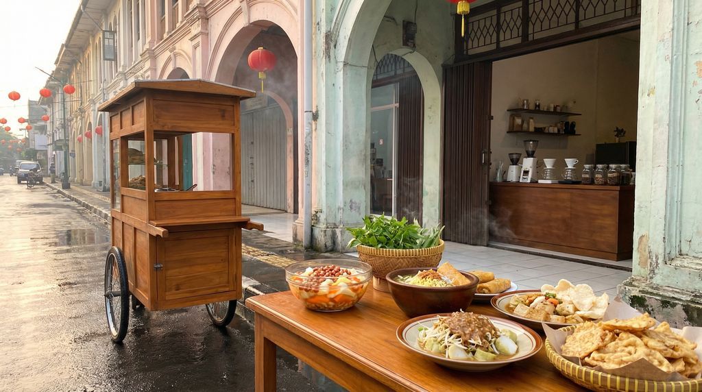 Eten is hier een route op zichzelf. Langs de stoepen staan streetfoodstalletjes en “kaki lima” met lokale favorieten: asinan Bogor met frisse pekelgroenten en pinda’s, soto mie met bouillon en krokante kroepoek, toge goreng met rijke saus, doclang in bananenblad, laksa Bogor met dikke kokosbouillon en dampende bakso uit diepe pannen. Zoete pauzes vind je bij kue cubit of kleverige kue lapis; als dorstlesser is er es pala Bogor of een sterke kopi tubruk. Overdag proef je het snel, staand onder de arcades; tegen de avond komt er een extra gloed over de stalletjes en zwelt de geur van gebakken deeg en bouillon aan.