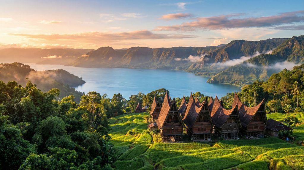 Ten westen van het Indonesische vasteland strekt Sumatra zich ruim 1.700 kilometer uit langs de evenaar, met een oppervlakte van meer dan 470.000 km². Het eiland wordt doorsneden door de Bukit Barisan, een keten van vulkanen die uitmondt in nevelwouden, kratermeren en steile valleien. In het noorden gaapt de caldera van Danau Toba, het grootste kratermeer ter wereld, terwijl aan de kusten palmenstranden en mangrovezones afwisselen met vissersdorpen. De culturele lappendeken is even rijk als het landschap: van de islamitische tradities in Aceh tot de Batak-volkeren rond Toba en de matrilineaire Minangkabau in West-Sumatra, plus de eigenzinnige identiteiten van Nias en de Mentawai-eilanden. Dorpsarchitectuur met puntige daken, markten vol specerijen en een waaier aan talen en muziekstijlen geven elke regio een eigen karakter.