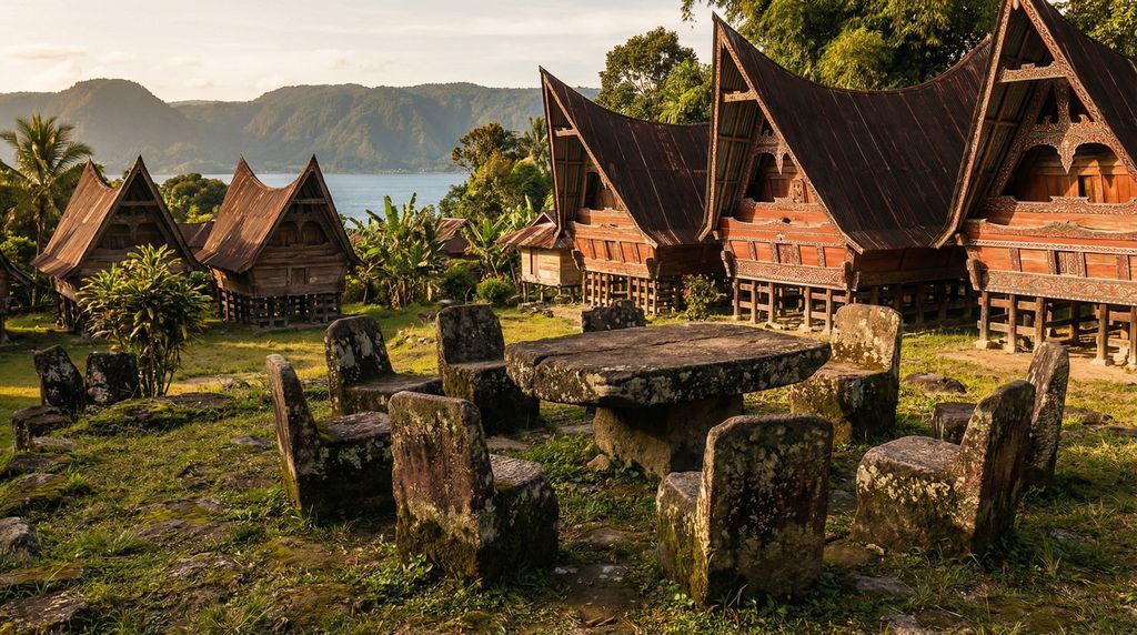 Rond Danau Toba ontvouwt het Batak-erfgoed zich op Samosir in dorpen met imposante rumah adat: houten huizen op palen, met hoog opkrullende daken en expressieve gorga-houtsnijwerken in rood, wit en zwart. Deze ornamenten verbeelden bescherming, kosmologie en clanidentiteit. In Huta Bolon Simanindo hoor je bij voorstellingen de opzwepende klanken van het gondang-ensemble, terwijl dansers in traditionele kleding verhalen uitbeelden. Weefsters maken ulos-sjalen op smalle weefgetouwen; elke kleur en elk motief draagt een sociale of rituele betekenis, bijvoorbeeld bij huwelijk of geboorte. In Tomok herinneren stenen sarcofagen van de koningen van Sidabutar aan een roemrijk verleden, en bij Ambarita liggen de beroemde stenen stoelen waar recht werd gesproken, stille getuigen van lokaal bestuur en adat.