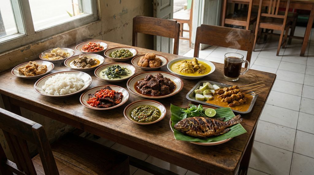 De geuren van kruidnagel, citroengras en geroosterde kokos hangen in de lucht, pannen sissen en opgestapelde borden schitteren in de middagzon. Eten op Sumatra is levendig, gul en diep gekruid, met regionale trots die je proeft in elke hap.