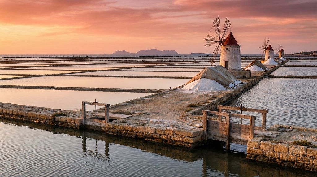 In het westen ontvouwen Trapani en Marsala een kalmer ritme. De zoutpannen spiegelen wolken en windmolens, met zonsondergangen die het water in koper doen verkleuren. Vanuit Trapani ben je zo op de Egadische eilanden: Favignana om te fietsen langs baaien, Levanzo voor rustige wandelingen en Marettimo voor puur blauw water en kliffen. Rond Marsala vind je wijnkelders waar lokale varianten rijpen; aan de Stagnone-lagune wieken kitesurfers over spiegelglad water en ligt het Fenicische eiland Mozia binnen handbereik.