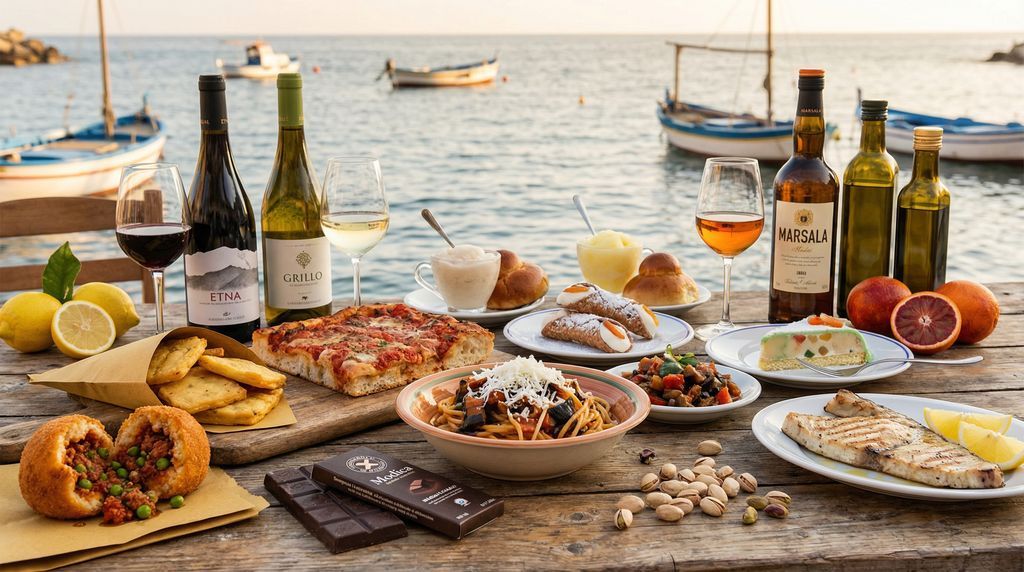 Ook aan tafel schuilt verrassing in eenvoud. Arancini die barsten van ragù of pistache, panelle die knisperen, pasta alla Norma met aubergine en ricotta salata, caponata met rozijnen en pijnboompitten: smaken die uitblinken zonder opsmuk. Aan de kade sissen zwaardvisfilets, in patisserieën wachten cannoli en cassata, en ’s ochtends hoort granita met brioche tot de normale orde van de dag. Wijn vult de zinnen met landschap: mineraal wit en fijn kruidig rood van Etna DOC, zonnige Nero d’Avola, zilte frisheid van Grillo, en Marsala die zich net zo thuis voelt bij kaas als bij dessert. In elk glas proef je zon, wind en vulkanische grond.