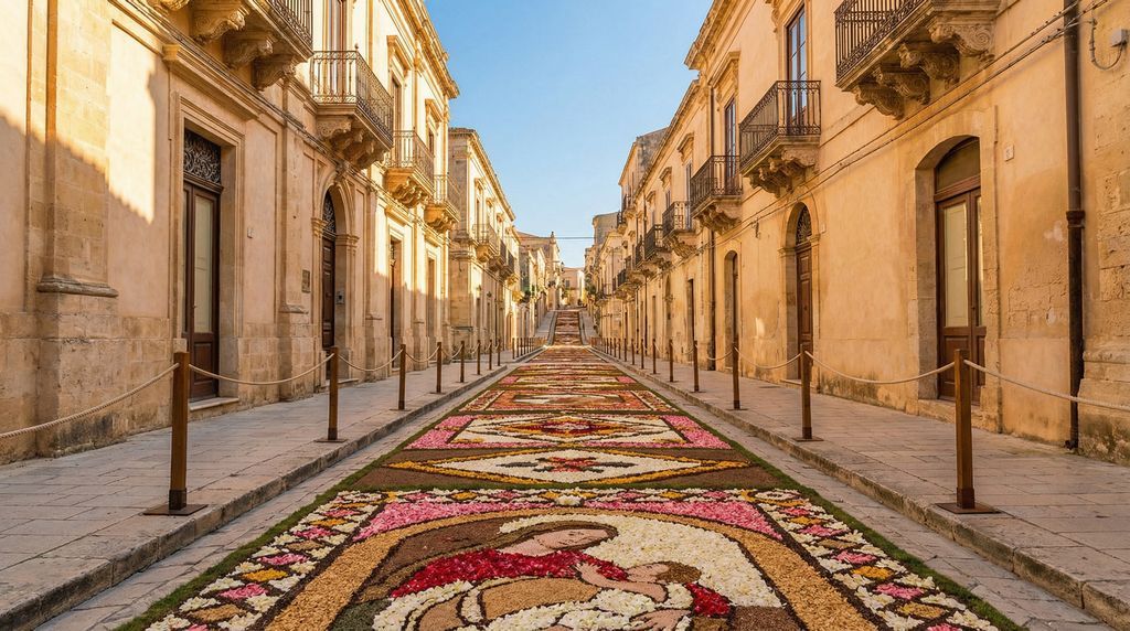 In mei verandert Noto in een openluchtatelier tijdens de Infiorata di Noto. Over de hellende Via Nicolaci leggen kunstenaars tapijten van bloemblaadjes, zaden en grassen, met elk jaar een nieuw thema. Balkons met smeedijzeren krullen hangen vol, gevels gloeien honingkleurig en de zoete geur van bloemen hangt tussen de barokke palazzi. Overdag bewonder je de patronen in detail; tegen de avond vallen de schaduwen langer en komen kleuren nog intenser tot leven. Reken op drukte in het weekend en sluit aan bij de slingerende route die door stegen en pleinen voert, waar ook kleine exposities, muziek en ambachtelijke kramen opduiken.