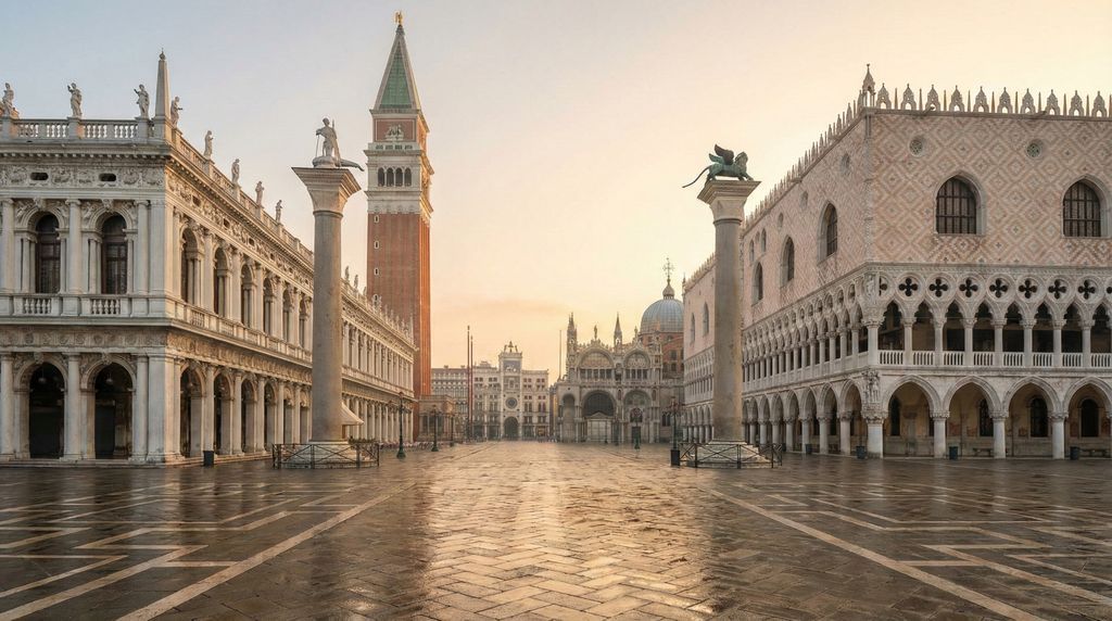 Het hart van Venetië klopt op en rond het San Marcoplein, een theatrale ruimte waarin architectuur, licht en water samenkomen. Onder de arcaden van de Procuratie Vecchie en Nuove schuilen elegante cafés en boetieks; achter de statige gevels liggen museale schatten. In de Procuratie Nuove leiden de zalen van Museo Correr je door de stedelijke geschiedenis, met kaarten, schilderijen en werken van onder anderen Canova, terwijl het aanpalende Museo Archeologico Nazionale en de monumentale ruimtes van de Biblioteca Nazionale Marciana klassieke sculpturen en zeldzame manuscripten tonen. Op de Piazzetta, richting het water, bepalen de granieten zuilen met de heiligen San Marco en San Teodoro het toneel.