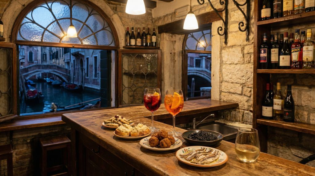 De Venetiaanse keuken proef je het best staand aan de toog van een bacaro. Hier liggen borden vol cicchetti: kleine hapjes die je per stuk kiest en combineert met een ombra, een glas lokale wijn. Denk aan crostini met baccalà mantecato, polpette di carne, minipaneelkoekjes met ansjovis, of sarde in saor die hun zoetzure geur verspreiden. Ga begin van de avond (17.00–19.30 uur) wanneer locals binnenlopen voor een snelle stop; rond de Rialtomarkt is het drukker, rustiger alternatieven vind je in Cannaregio en Dorsoduro, in zijstraten net buiten de hoofdroute.
