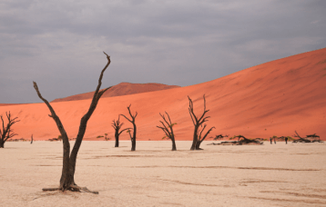 De Sossusvlei is een andere must-see in Namibië. Het is beroemd om de hoogste zandduinen ter wereld, die in de ochtend- en avondzon baden in een scala aan kleuren, van tinten roze tot dieprood. Klimmen op de daken van de wereld kan hier op Dune 45 of Big Daddy, vanwaar de uitzichten over de zee van zand eenvoudigweg adembenemend zijn. In de nabijgelegen Deadvlei, een witte kleipan omgeven door dode boomstammen die een surrealistisch landschap vormen, kunnen fotografen hun hart ophalen aan de dramatische contrasten en schaduwspelen.