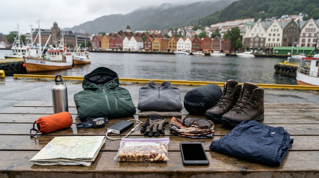 Bergen vraagt om slimme bagagekeuzes. Neem een volledig waterdichte jas met capuchon mee, plus lagen die je kunt combineren (bijv. merinowol, fleece, softshell). Stevige, bij voorkeur waterdichte wandelschoenen geven grip op natte kinderkopjes en modderige paden; een lichte regenbroek is fijn bij buien. In je dagrugzak: herbruikbare waterfles, snacks, powerbank, papieren kaart/telefoon met offline kaarten, zonnebrand en zonnebril. Voeg een muts of buff, dunne handschoenen en een extra paar sokken toe—op de berg voelt het al snel frisser aan. Een compacte drybag houdt camera en documenten droog.