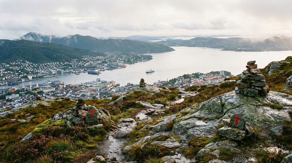 Voor uitzichten die de stad en de fjorden in één blik vangen, neem je de Fløibanen naar de top van de Fløyen. Boven wacht een netwerk van korte, goed gemarkeerde wandelroutes, een grote speeltuin en kindvriendelijke activiteiten zoals het trollenbos. Picknickplekken kijken uit over daken, eilanden en zee. Avonturiers kiezen voor Ulriken, de hoogste stadsberg, bereikbaar via de Ulriken643-kabelbaan. Op het panoramaplatform voel je de wind van het hoogland, en wie goede schoenen draagt kan hier starten aan de Vidden-hike: een spectaculaire bergkamwandeling die Ulriken met de Fløyen verbindt.