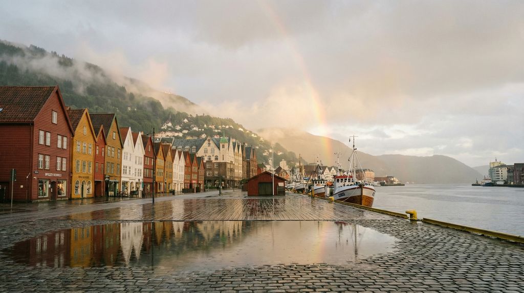 Bergen heeft een mild zeeklimaat dat sterk wordt beïnvloed door de warme golfstroom. Neerslag valt het hele jaar door en het weer kan meerdere keren per dag omslaan. Zomers zijn koeler dan in het binnenland, winters zachter; denk aan zomerdagen die vaak tussen 15 en 20 graden liggen, en winterdagen die zelden extreem koud zijn. Regen- en winddichte kleding is geen luxe, maar basisuitrusting, ook in de warmste maanden. Wie flexibel plant, haalt het meeste uit de snel wisselende omstandigheden.