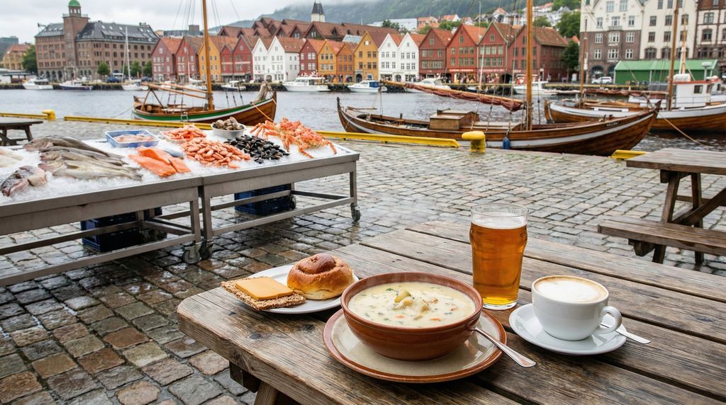 Lokale klassiekers geven kleur aan elke maaltijd. Bergense vissoep is romig en rijk, met stukjes witte vis, garnalen en groenten, vaak afgerond met dille en een dot room. Raspeballen, ook wel komle genoemd, zijn stevige aardappelbollen die traditioneel met spek, worst en koolraapstamppot worden geserveerd; een ideale keuze na een frisse bergwandeling. Voor zoet ga je voor een skillingsbolle, het kaneelbroodje dat je in bakkerijen door de hele stad vindt, liefst nog warm. Brunost, de karakteristieke karamelige bruine kaas, proef je op wafels of op brood; subtiliteit is hier niet het doel, wel comfortfood met karakter. Tussendoor zijn fiskekaker (viskoekjes) een snelle, hartige snack.