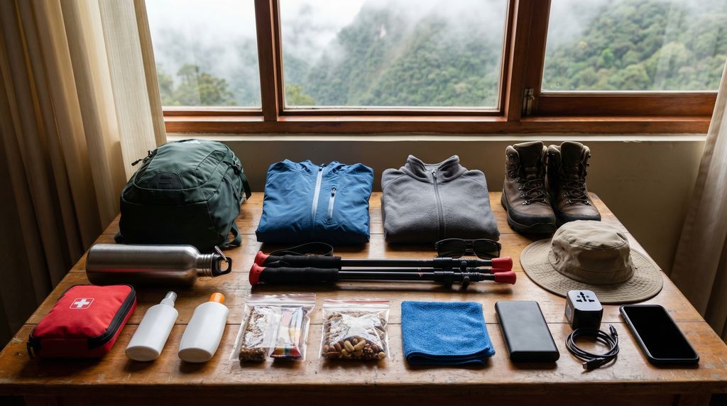 Een goede dagrugzak begint bij laagjes die je eenvoudig kunt wisselen. Neem een ademend T‑shirt, een warme laag voor de vroege ochtend (fleece of licht dons) en een lichte regenjas of hardshell mee. Een zonnehoed of pet, zonnebrand met hoge factor en een zonnebril beschermen tegen de sterke uv-straling op hoogte. Voeg insectenwerend middel toe (bijvoorbeeld DEET of picaridine), zeker rond Aguas Calientes en de lagere bosrand waar zandvliegen actief kunnen zijn.