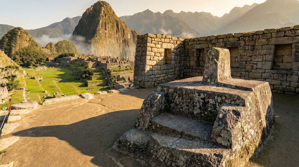 In het ceremoniële hart ligt het Heilige Plein, omringd door monumenten die architectuur en kosmologie verenigen. De Tempel van de Drie Ramen kadreert het landschap en mogelijk ook astronomische richtingen, terwijl de vlakke stenen en nauwkeurige voegen de seismische robuustheid verraden. Iets verderop bevindt zich de Tempel van de Zon, met lichtopeningen die rond zonnewendes van betekenis zijn en een onderliggende ruimte die als grafkamer of heiligdom kan hebben gediend. Op een hoger platform staat de Intihuatana-steen, vaak geïnterpreteerd als een rituele “zonnewijzer” waarmee schaduwen en seizoenen werden gevolgd. Let op de fijn geschaafde randen en de positionering ten opzichte van de omringende pieken.