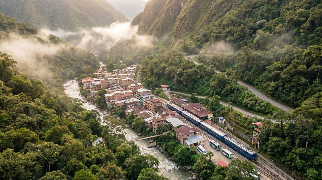 Machu Picchu ligt in het zuidoosten van Peru, tussen Cusco en de Heilige Vallei, hoog boven de bochtige Urubamba-rivier. De toegangspoort is Aguas Calientes, officieel Machu Picchu Pueblo, een compact stadje aan de voet van de berg. Er is geen autoweg naar de ruïnes; vrijwel alle bezoekers reizen per trein naar Aguas Calientes en nemen vervolgens de shuttlebus of gaan te voet omhoog. De ligging maakt het logistiek overzichtelijk: alles stroomt via dit dal samen naar de ingang van de citadel.