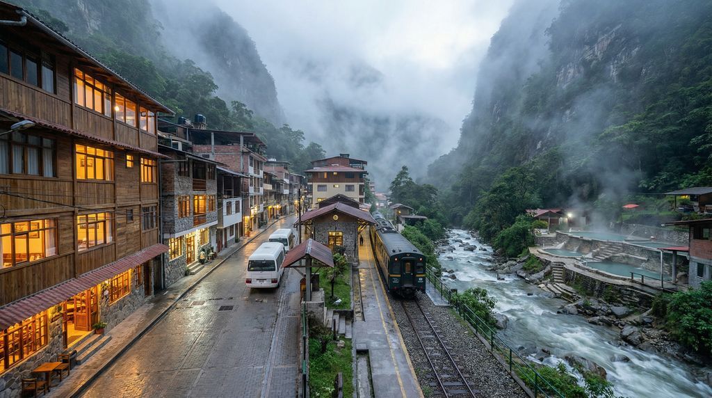 Aguas Calientes (Machu Picchu Pueblo) is een compact, autovrij dalstadje waar alles draait om het spoor en de toegang tot de ruïnes. Je vindt er een breed aanbod aan hotels en hostels, van eenvoudige kamers tot comfortabele boutique-opties met uitzicht op de Urubamba-rivier. Restaurants serveren Peruaanse klassiekers en internationale gerechten; verwacht toeristische menukaarten, maar ook enkele goede ceviche- en grilladressen. De warmwaterbronnen aan de rand van het dorp zijn populair na een wandeldag; neem slippers en een sneldrogende handdoek mee. Het station vormt het logistieke hart: treinen komen en gaan vrijwel de hele dag, wat levendigheid én geluid met zich meebrengt.