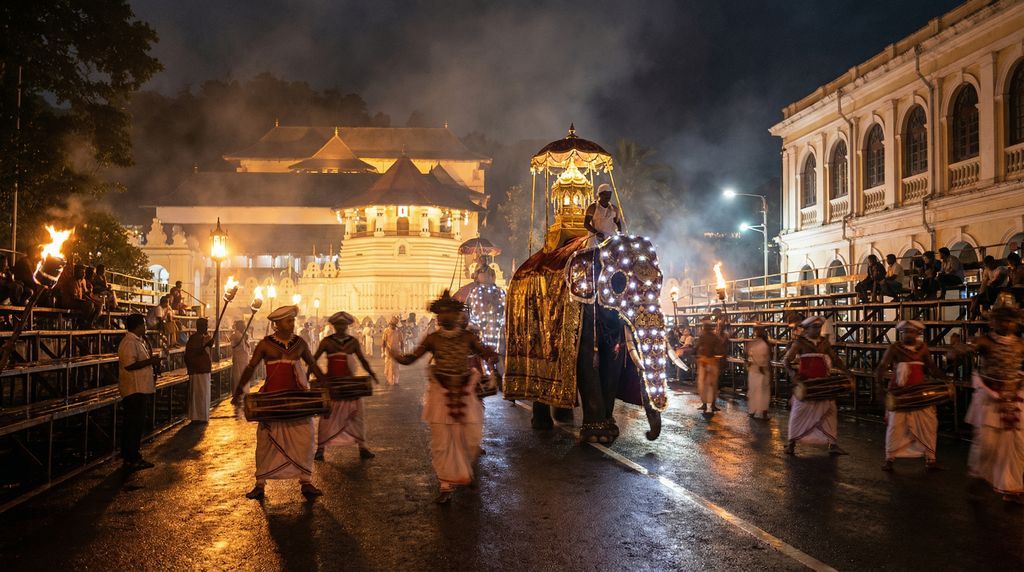 Wanneer de dagen in juli en augustus korter worden, vult Kandy zich ’s avonds met de diepe cadans van drums, schelphoorns en brandende fakkels: de Esala Perahera. De processie vindt haar oorsprong in de verering van de Heilige Tandrelikwie van de Boeddha, gedragen in een vergulde schrijn (replica) die symbool staat voor zegen en legitimiteit. Kumbal- en Randoli-nachten volgen elkaar op, met Kandyaanse dansers, zweepklappers, vuurdragers en fraai uitgedoste olifanten die langs het meer en de Tempel van de Tand trekken. Voor pelgrims is dit een moment van toewijding; velen vasten, offeren bloemen en bidden om voorspoed.