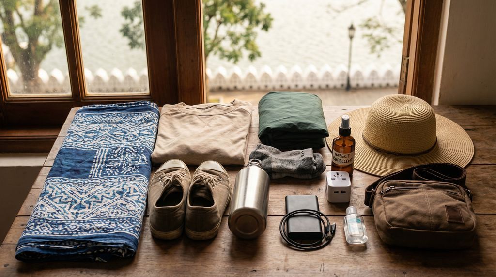 Inpakken doe je in lagen. Neem lichte, ademende kleding (katoen, linnen of technisch) voor overdag en een lichte trui of sjaal voor koele avonden en treinritten. Comfortabele wandelschoenen met profiel zijn aan te raden; voeg sneldrogende sokken toe als je veel trappen en paden neemt. Een compact regenjack of poncho is onmisbaar in moessonmaanden, net als zonbescherming: brede hoed of pet, zonnebril en zonnebrand met hoge SPF. Handig verder: een opvouwbare sarong voor tempelbezoek, een waterdichte hoes of drybag voor telefoon en camera, muggenspray, basis-ehbo en een herbruikbare waterfles. Zo ben je voorbereid op wisselvallig bergweer zonder in te leveren op comfort.
