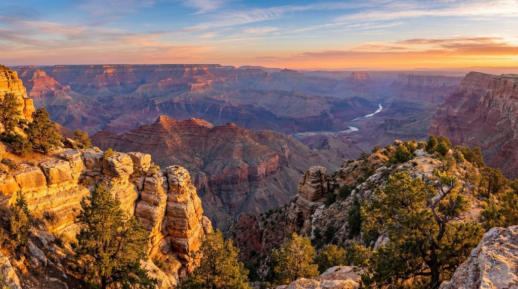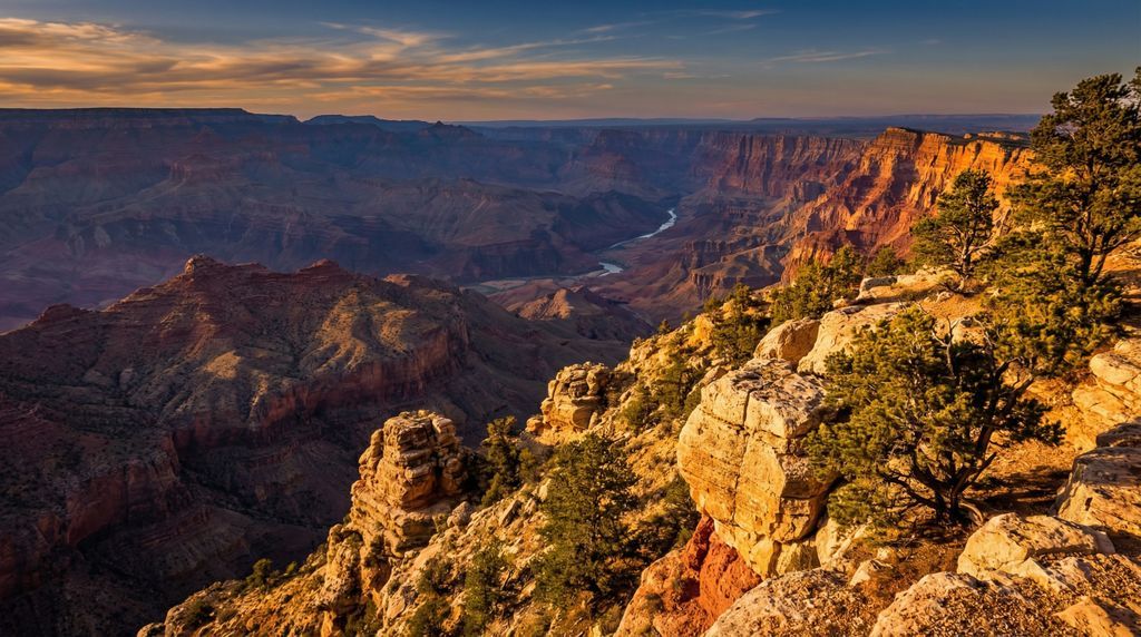 Genesteld in het noorden van Arizona snijdt de Grand Canyon als een kolossale kloof door het Coloradoplateau. Met een lengte van circa 446 kilometer, een breedte tot 29 kilometer en een diepte van meer dan 1.800 meter toont het landschap een spectaculaire opeenvolging van geologische lagen. De Colorado River, die zich door de bodem van de kloof slingert, heeft dit meesterwerk gedurende miljoenen jaren uitgesleten en bepaalt nog steeds het reliëf, het microklimaat en de dynamiek van de canyon.
