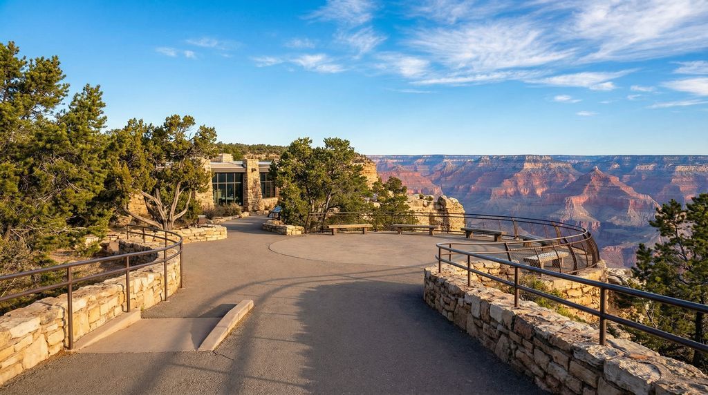 Delen van de Rim Trail zijn rolstoeltoegankelijk en prettig vlak, met verharde oppervlakken en relatief kleine hellingspercentages. Het traject tussen het Grand Canyon Visitor Center, Mather Point en Yavapai Geology Museum is populair: brede paden, leuningen en uitzichtplatforms maken fotograferen en pauzeren eenvoudig. Bij Mather Point zijn voorzieningen zoals toegankelijke toiletten en nabijgelegen gehandicaptenparkeerplaatsen. Het Yavapai Geology Museum zelf is toegankelijk en beschikt over grote ramen die het panorama als een levend geologiemodel inkaderen. Aan de oostzijde zijn in de Desert View‑omgeving verschillende verharde looppaden naar uitzichtpunten en diensten; houd er wel rekening mee dat de Desert View Watchtower van binnen trappen heeft en niet toegankelijk is tot bovenin.