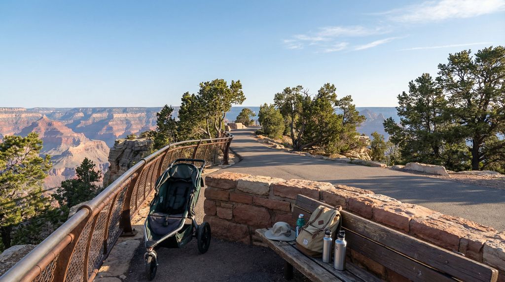 Wie met kinderwagen reist, vindt meerdere family‑friendly trajecten. Het stuk van de Rim Trail tussen het Visitor Center en Mather Point is doorgaans geschikt voor kinderwagens, net als het vlakke pad tussen Mather Point en Yavapai Geology Museum. Ook rond Market Plaza en in delen van de Desert View‑omgeving zijn verharde, brede paden met bankjes voor pauzes. Let op randen en drukte bij zonsopkomst en zonsondergang; houd kinderwagens altijd achter hekken en op veilige afstand van drop‑offs, zeker bij wind.