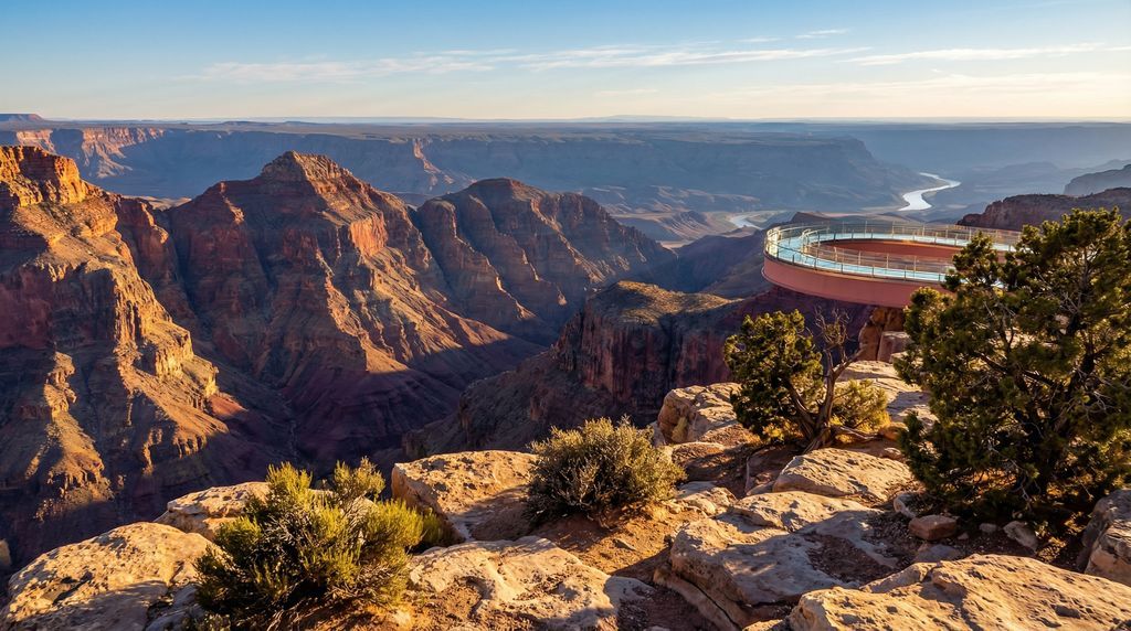 De West Rim ligt op Hualapai-land en maakt geen deel uit van Grand Canyon National Park. Toegang en prijzen worden apart beheerd; nationale parkpassen (zoals de America the Beautiful Pass) zijn hier niet geldig. De Skywalk bij Eagle Point is het icoon: een hoefijzervormige glazen loopbrug boven de afgrond, geflankeerd door Hualapai-culturele ervaringen en voorzieningen. Guano Point levert een 360-graden panorama met ruigere setting. Door de nabijheid van Las Vegas is de West Rim populair voor dagtochten en combinaties met helikopter- of vliegtuigexcursies. De sfeer is meer gericht op beleving en snelle highlights dan op uitgebreid wandelen.