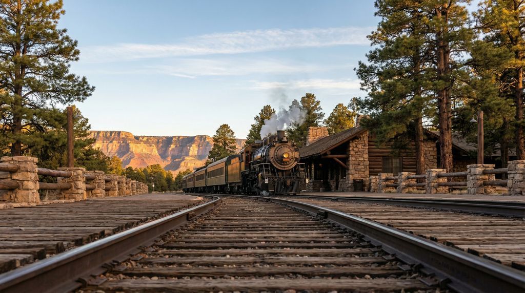 Wie file- en parkeerstress wil vermijden, kan de Grand Canyon Railway nemen vanuit Williams. Deze historische trein legt in circa 2 uur en 15 minuten de afstand naar de South Rim af en arriveert bij het Grand Canyon Depot, vlak naast El Tovar en Bright Angel Lodge. Er zijn verschillende reisklassen; op geselecteerde dagen rijdt een stoomlocomotief. Kaartjes raken in drukke seizoenen snel uitverkocht, dus vooraf boeken is verstandig. Parkeren kan bij het depot in Williams; eenmaal boven loop je zo naar viewpoints of stap je over op de parkshuttles.