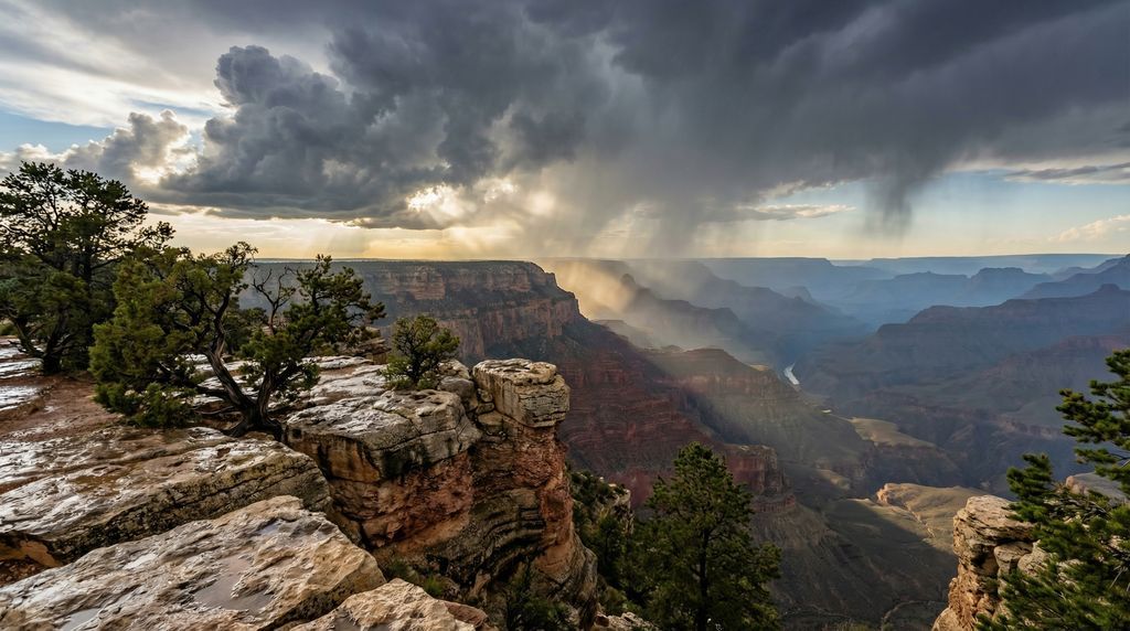 Tussen juli en september heerst de zomermoesson. Verwacht in de middag snel opbouwende onweersbuien met bliksem, windstoten, plotselinge regen en soms hagel. Deze buien kunnen lokaal voor flash floods zorgen in nauwe kloven en zijcanyons, zelfs als het elders droog lijkt. Plan activiteiten daarom vroeg op de dag, houd de lucht in de gaten en keer tijdig om als donder weergalmt of stapelwolken zich ontwikkelen. Schuil niet onder een eenzame boom of aan een richel tijdens onweer; wacht buien af op veilige, hogere en open locaties weg van randen.